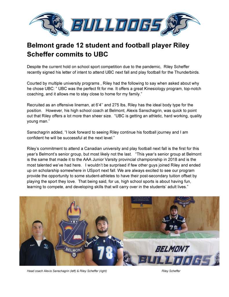 Congratulations to Belmont grade 12 student and football player Riley Scheffer who commits to UBC!