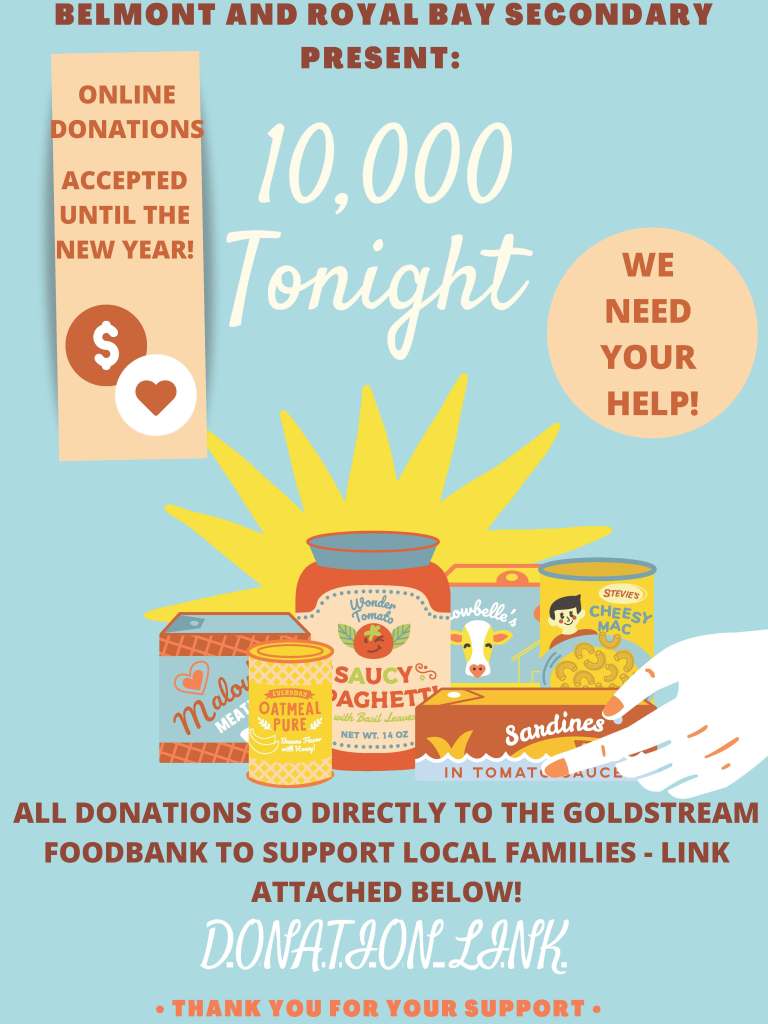 Does your family want to help the community this holiday season? Belmont Leadership class is once again supporting our annual 10 000 TONIGHT FOOD DRIVE in partnership with Royal Bay secondary school from November 30th – December 11th.