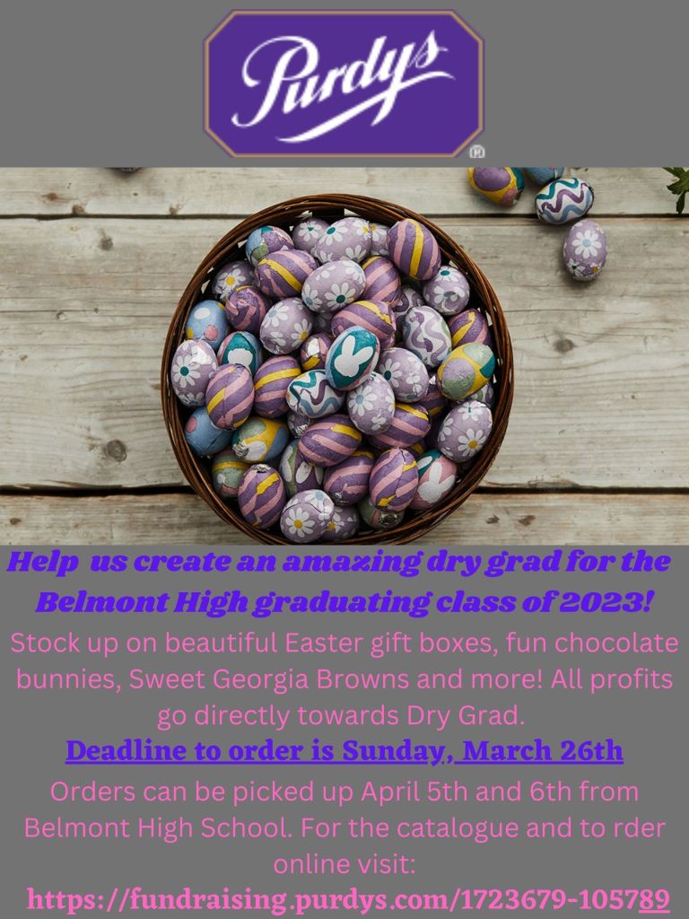 Looking for Easter Gift Ideas? Check out the poster below for more information on ordering Purdy’s Easter Treats, help support our Belmont Dry Grad 2023 fundraiser.