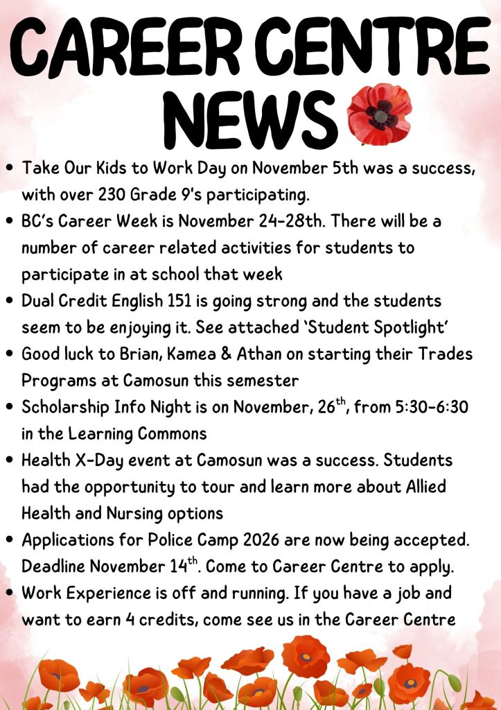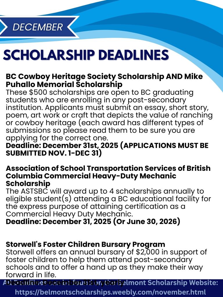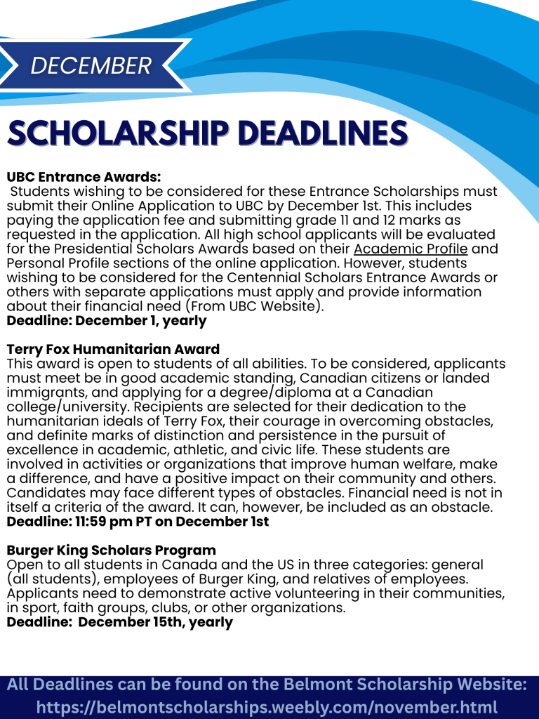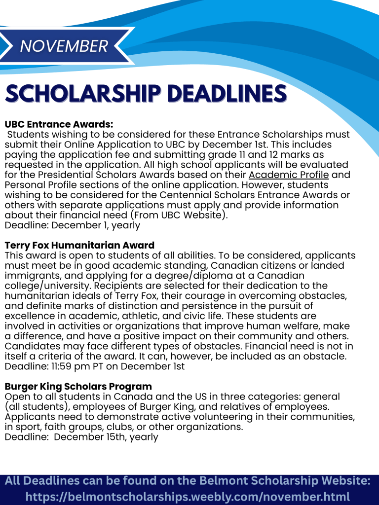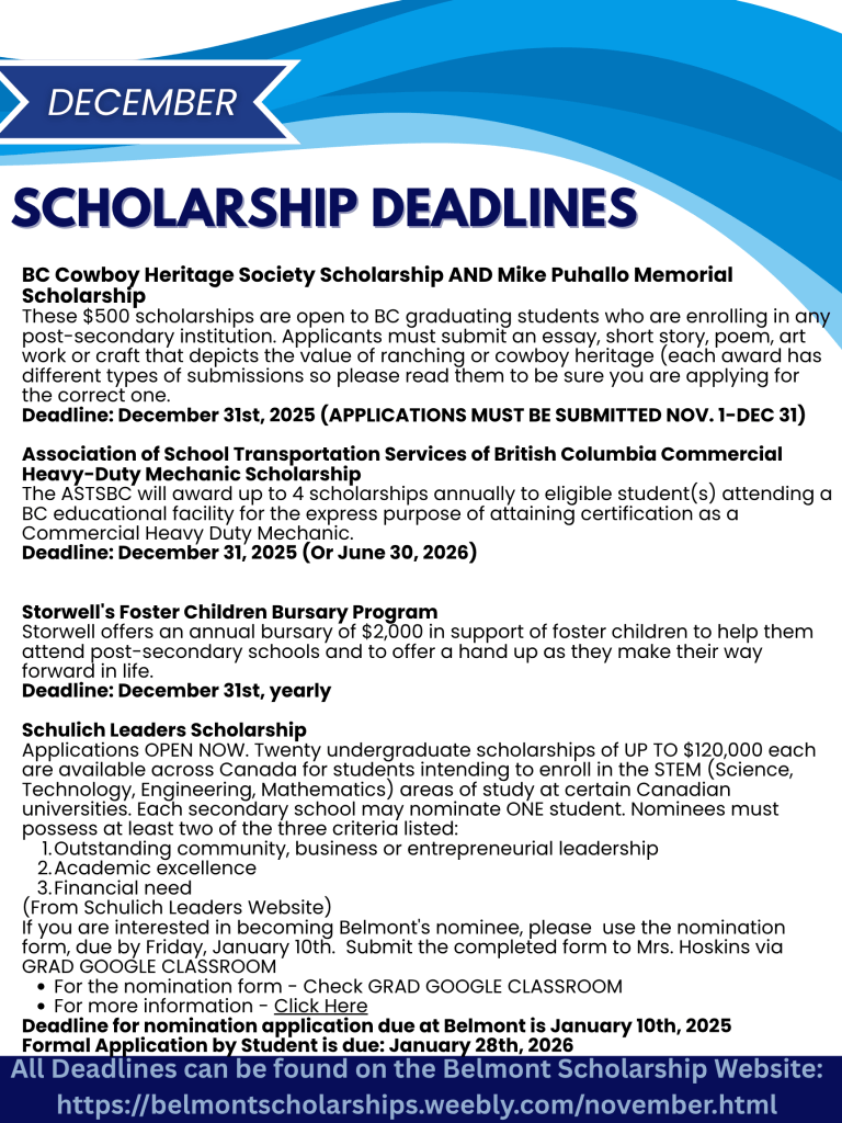 Please also see scholarship deadline flyers for upcoming December and January deadlines. See Mrs. Hoskins or Mrs. Colborne in the Career Centre if you need support!