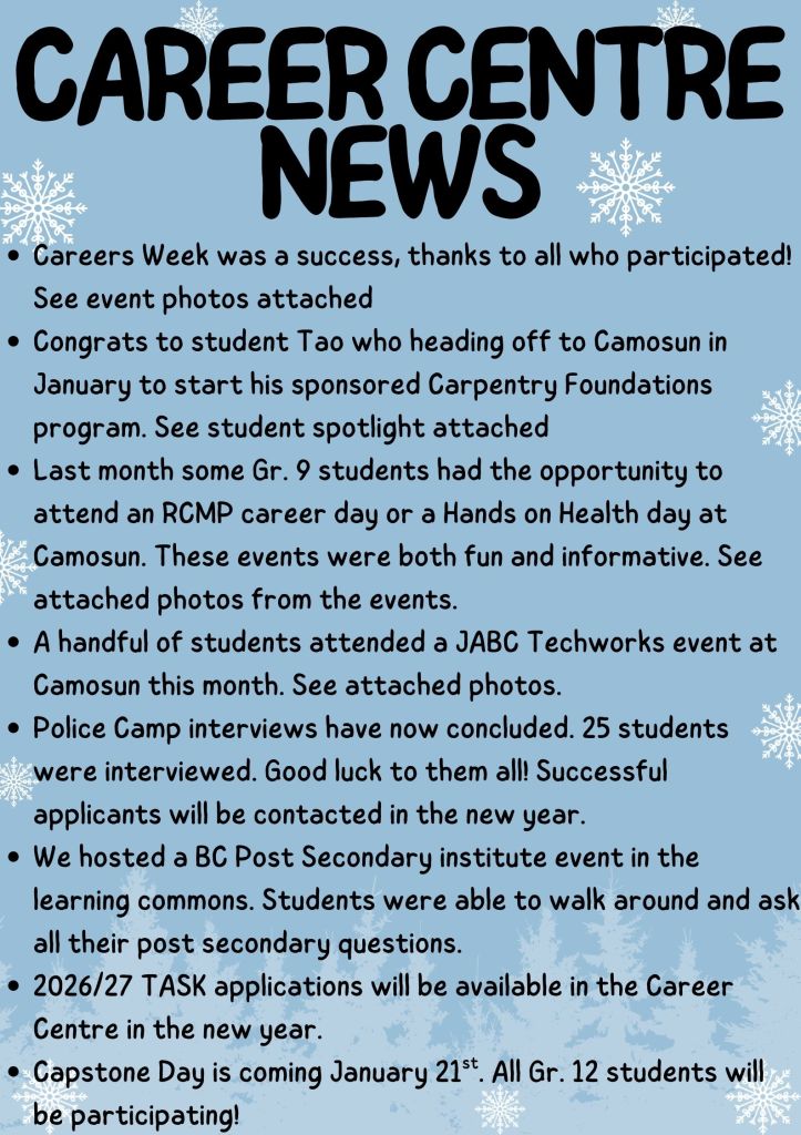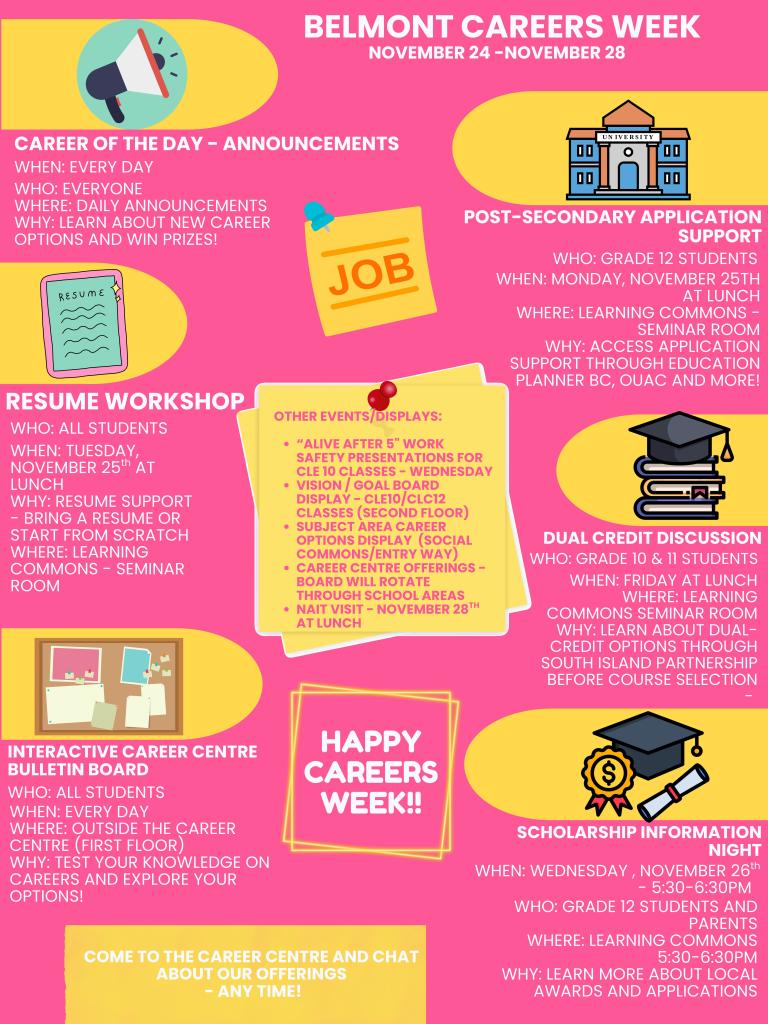Thank you to staff for your support with Career’s Week this year 🙂 We appreciate your support in engaging students in post-secondary and career pathways. See attached for Careers Week Recap!