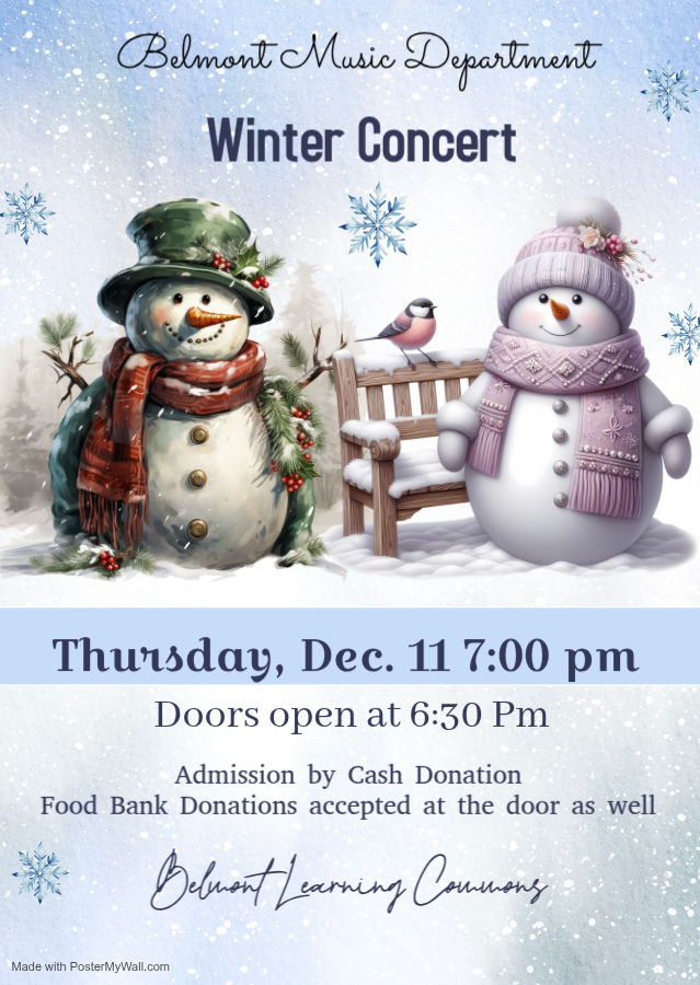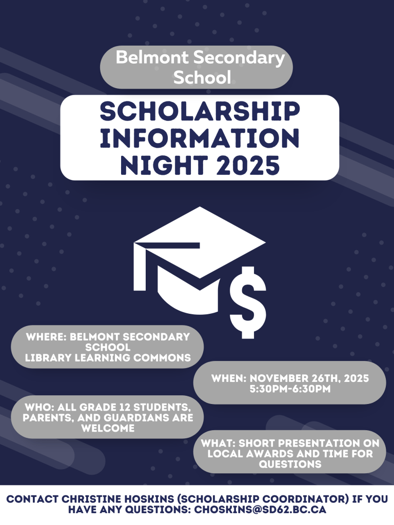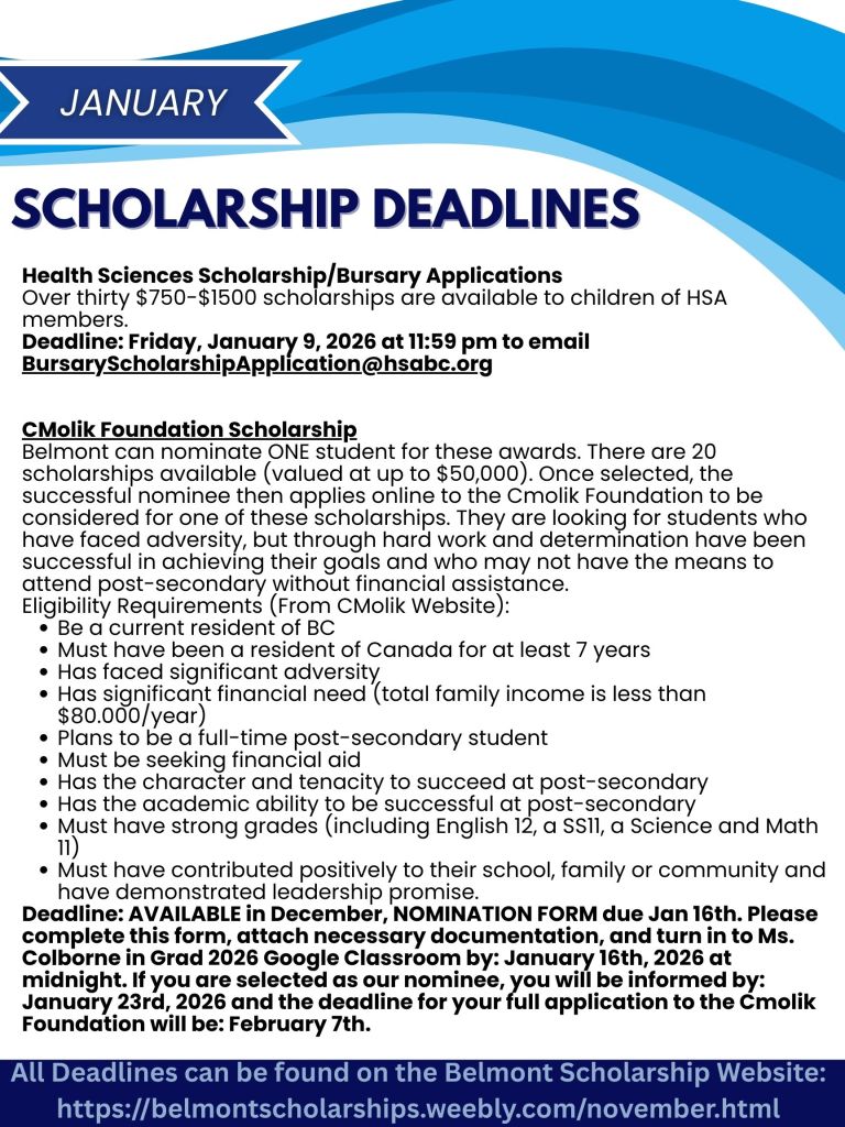 Grad Photos will be available December 14-19 in Belmont’s Learning Commons. Registration will be available mid November, with information shared to Grads in their Grade 12 assemblies and through their Google classroom. Information will also be updated online, and can be found through our Grad section on the school website.