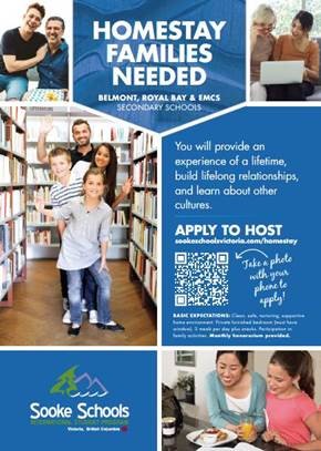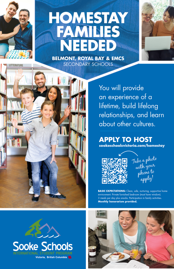 The school district’s International Program is looking for great host families who are interested in welcoming an international student into their home next school year. Students come from many different countries (Germany, Mexico, Thailand, Spain, Brazil, Japan, Italy, China, and more), and typically stay for 5 or 10 months, attending one of the high schools in the district. If you are interested in learning more, contact homestay@sd62.bc.ca. Families are encouraged to apply now, as placements are currently being made for September. To apply directly, use the QR code in the image below or visit http://www.sookeschoolsvictoria.com/homestay/