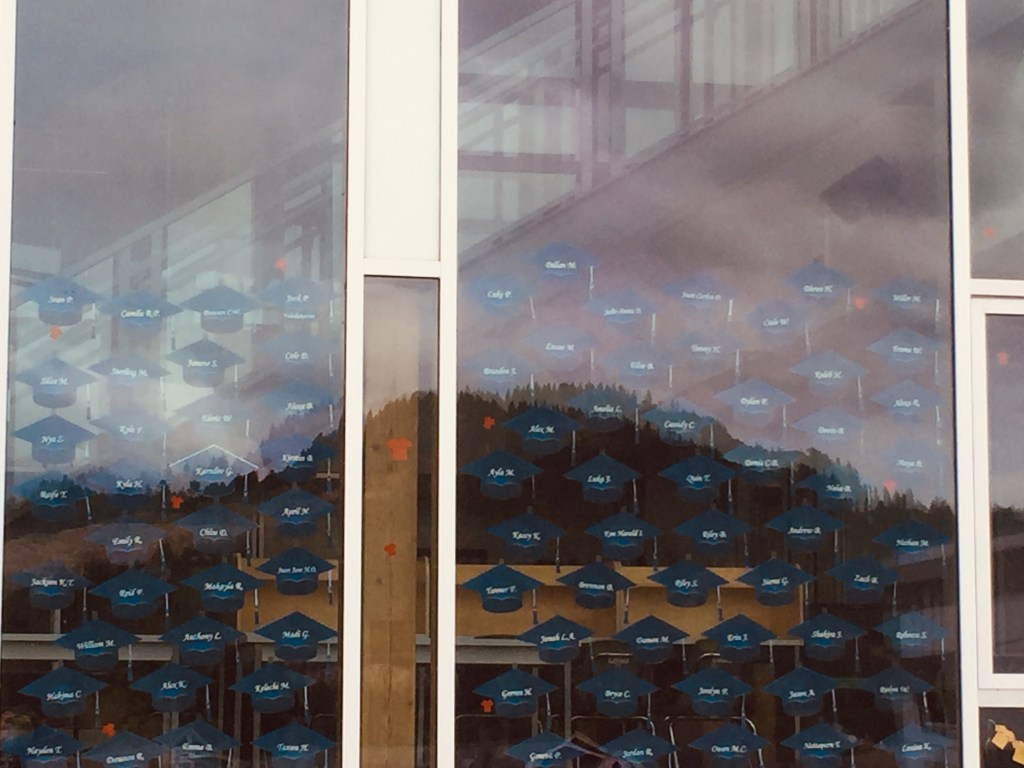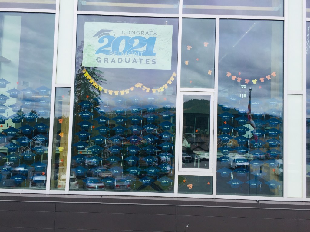 The clerical staff of Belmont has created a tribute to the graduating class of 2021 by making a grad cap for each student with their name on it. The caps are on display on the outside windows of the Library Learning Commons but there is something wrong with the display…..
